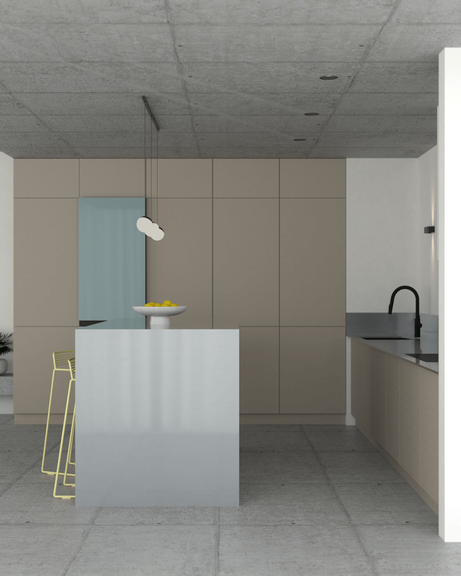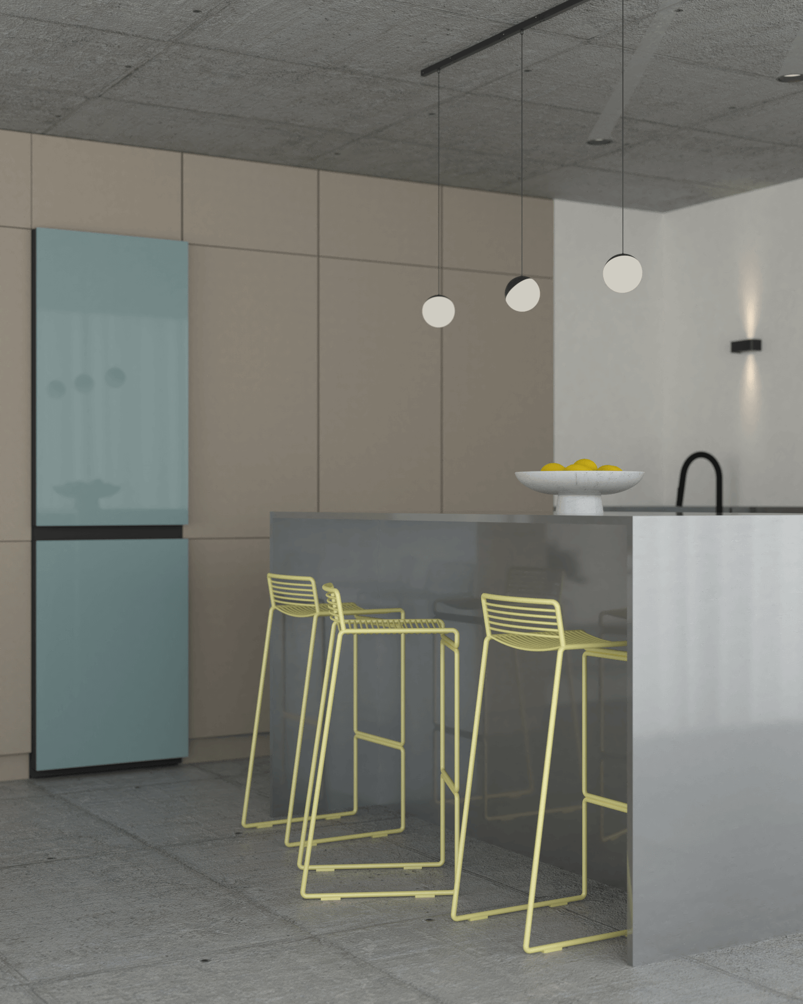 Salon w tym projekcie jest reprezentacyjną, otwartą przestrzenią pełną charakteru. Surowe betonowe wykończenia podłogi i sufitu tworzą mocną bazę, którą ocieplają beżowe zabudowy. W centrum uwagi są żółte krzesła barowe oraz te przy stole, które ożywiają przestrzeń salonu z aneksem kuchennym, harmonijnie komponując się z niebieską kanapą i lodówką.