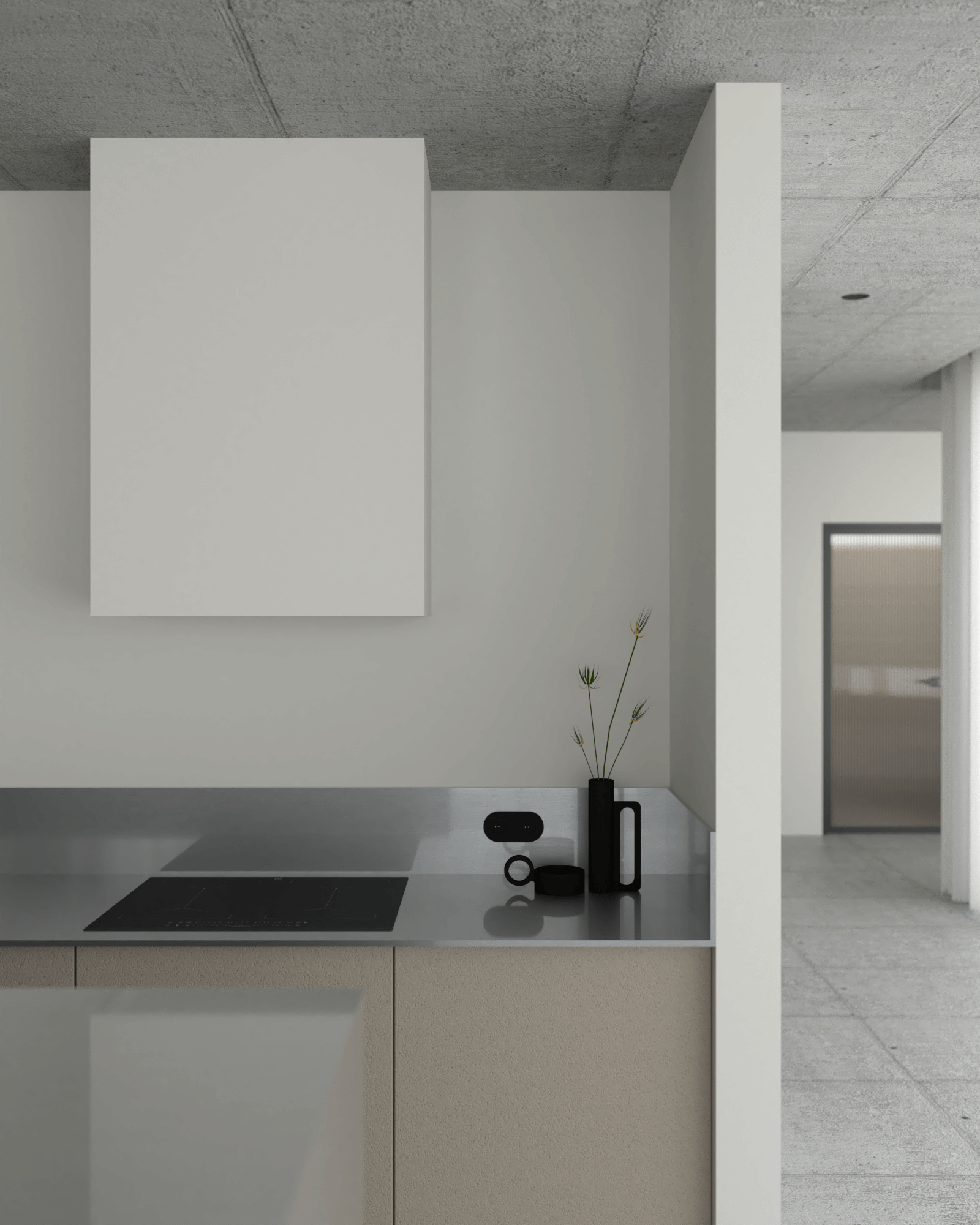 Beżowy lakier zabudowy kuchennej subtelnie ociepla surowy klimat aneksu kuchennego, w którym króluje beton i stal. Całe wnętrze wykończone jest subtelnymi czarnymi elementami w postaci oświetlenia i innych dodatków, co dodaje dynamiki wnętrzu oraz wprowadza kontrast.