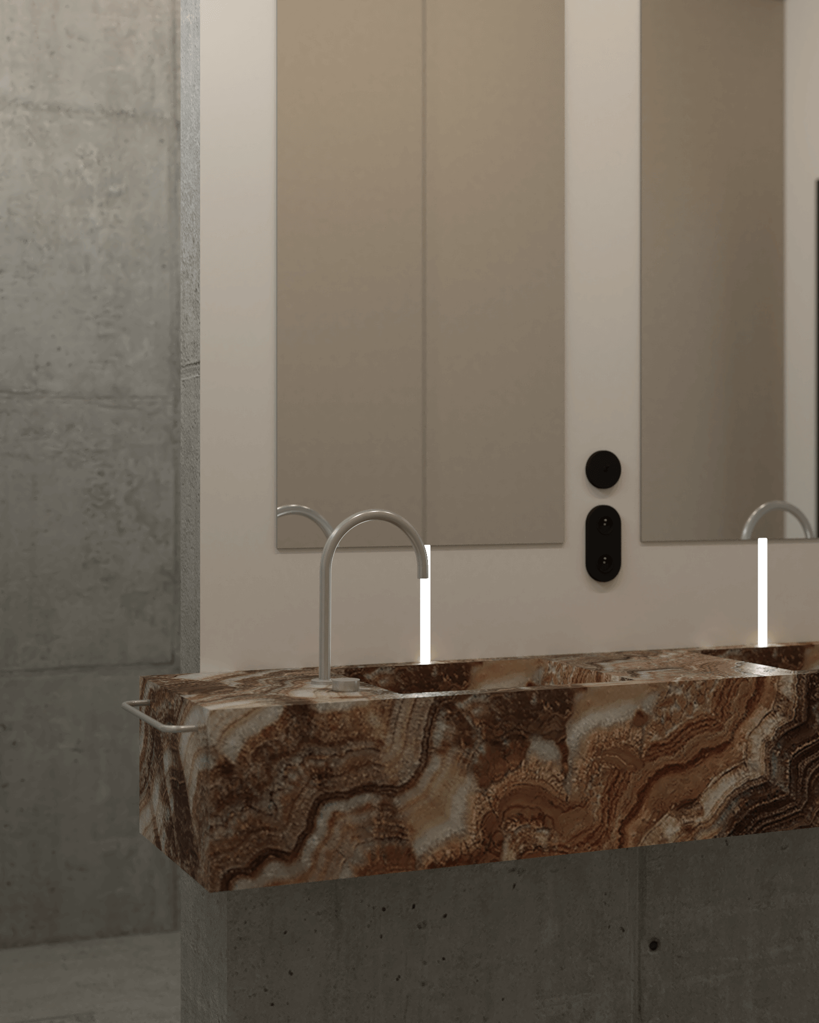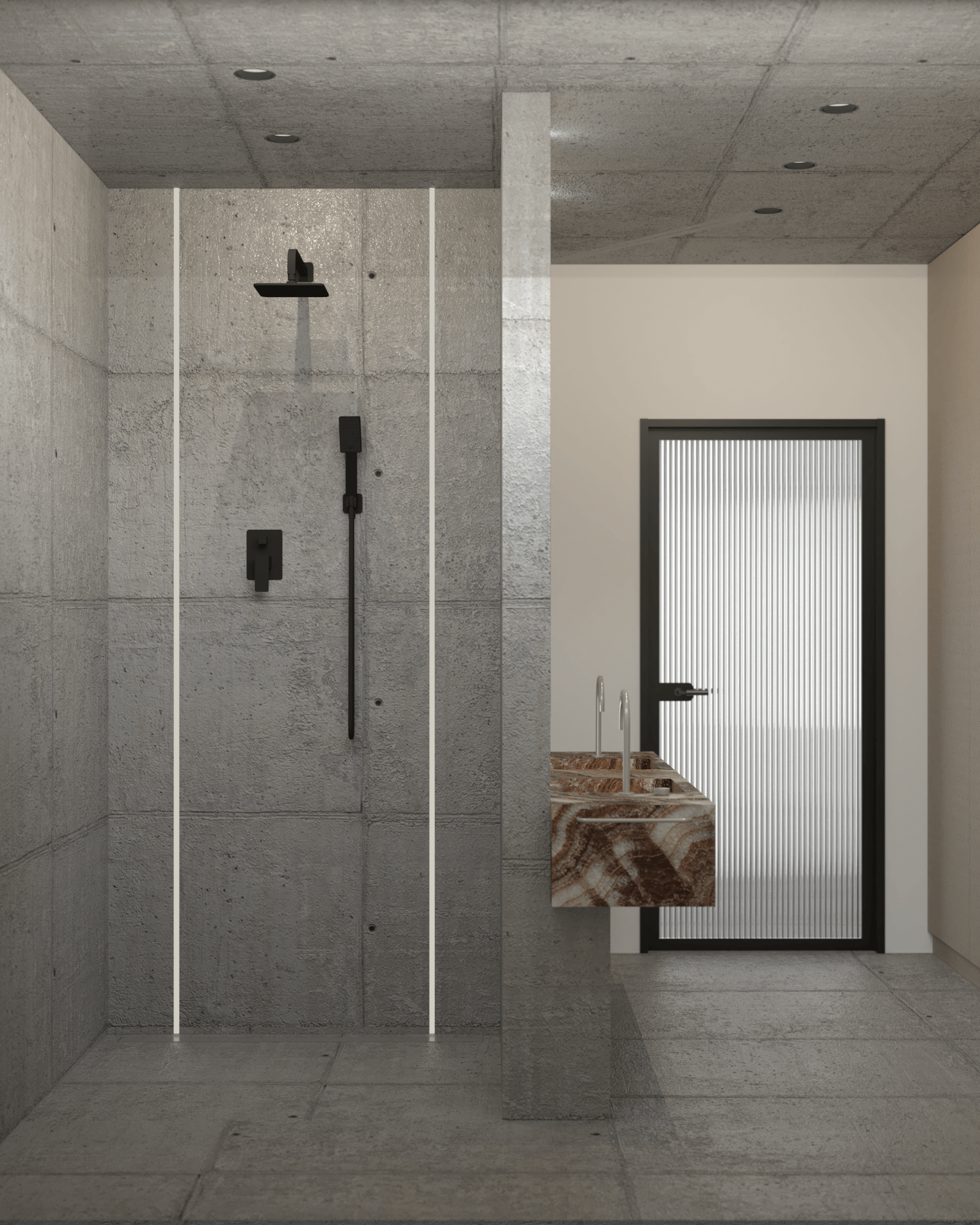 Łazienka łączy elegancję z funkcjonalnością. Naturalny kamień wprowadza luksusowy akcent, a innowacyjny układ pomieszczenia dodaje powiewu świeżości. Po lewej stronie od umywalki znajduje się duży prysznic typu walk-in, natomiast po prawej – toaleta. Ściana zabudowana pojemną szafą zapewnia miejsce na wszystkie niezbędne rzeczy, dzięki czemu łazienka pozostaje uporządkowana i komfortowa w codziennym użytkowaniu.