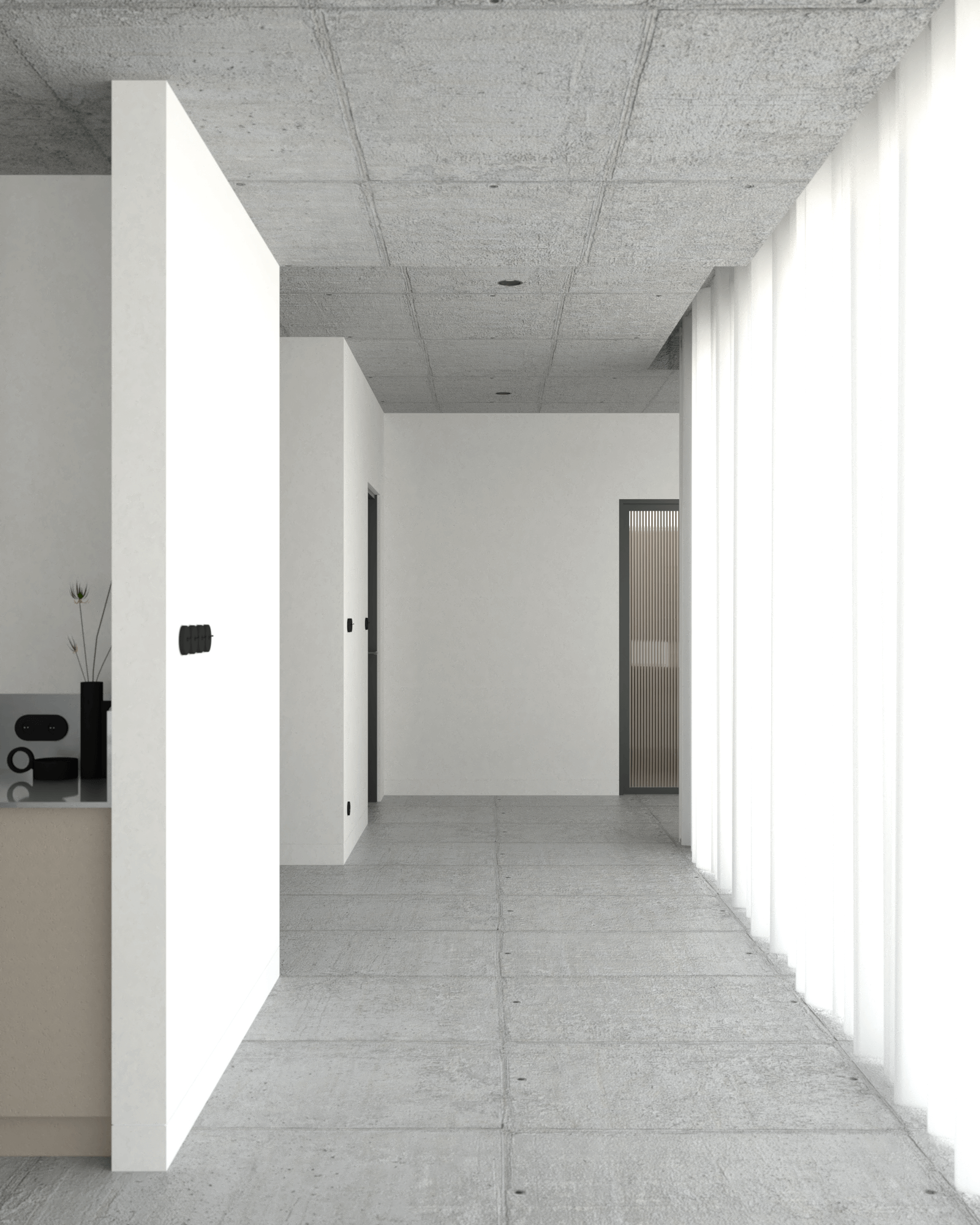 Delikatna struktura firan w korytarzu przepuszcza rozproszone światło, które nadaje wnętrzu lekkości i wpuszcza naturalną jasność, jednocześnie zapewniając prywatność. Przez duże przeszklenia, a także drzwi ze szkła flutes w czarnej ościeżnicy, mieszkanie przypomina galerię sztuki, gdzie każdy szczegół przyciąga wzrok. Dodatkowo prostota tego wnętrza ułatwia utrzymanie go w czystości.