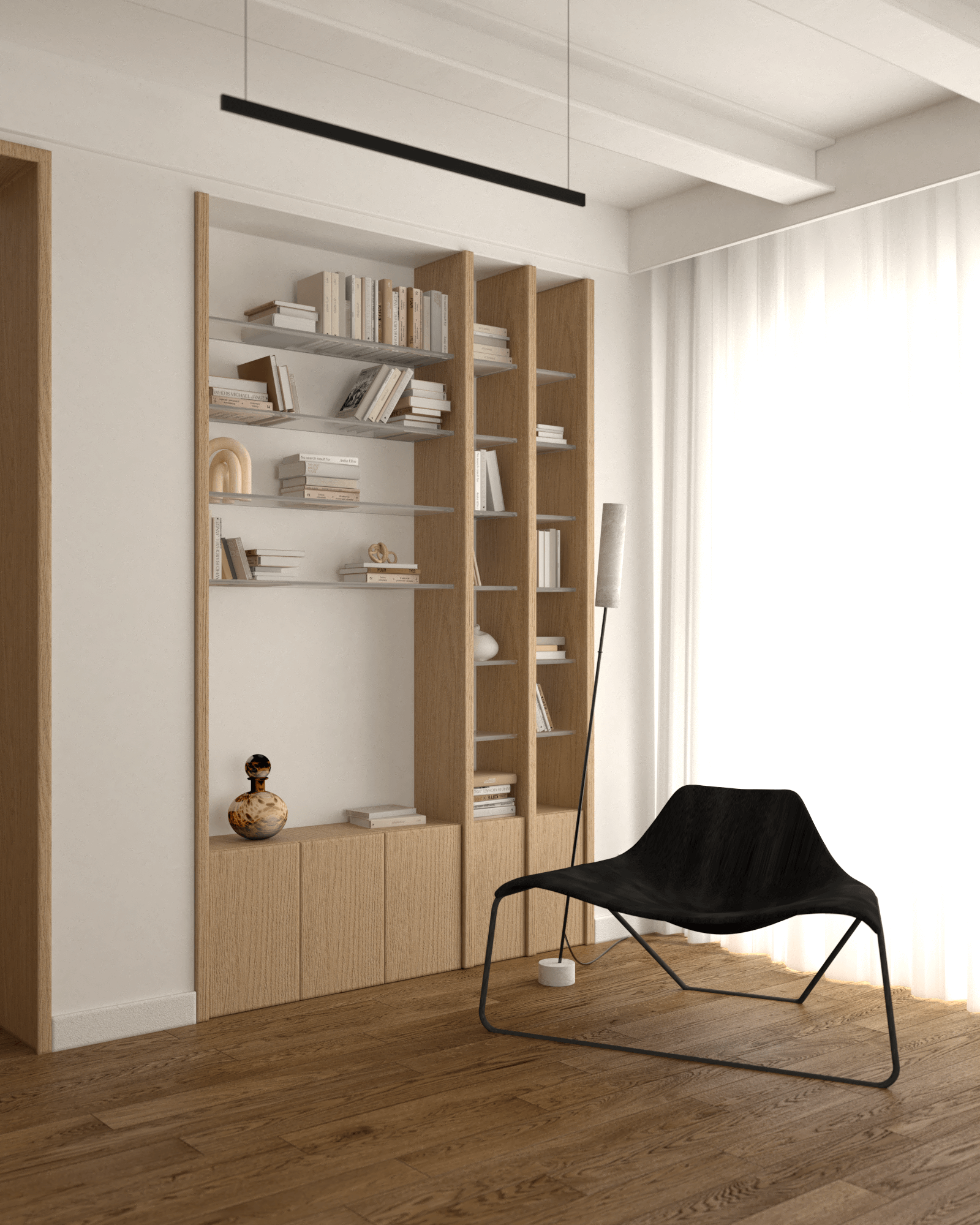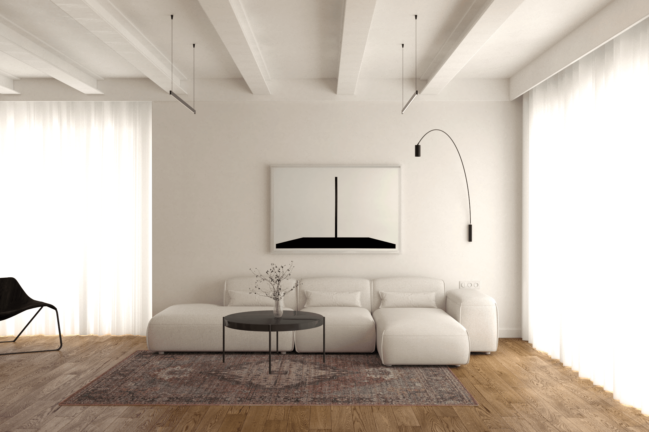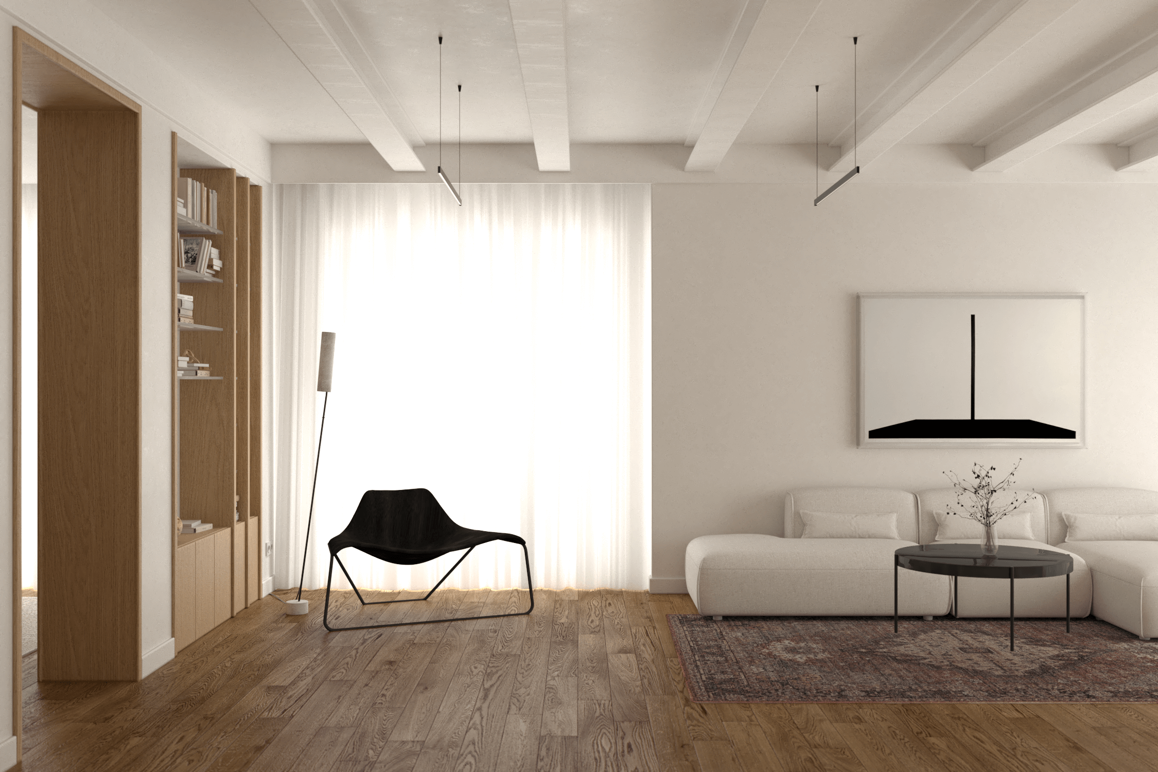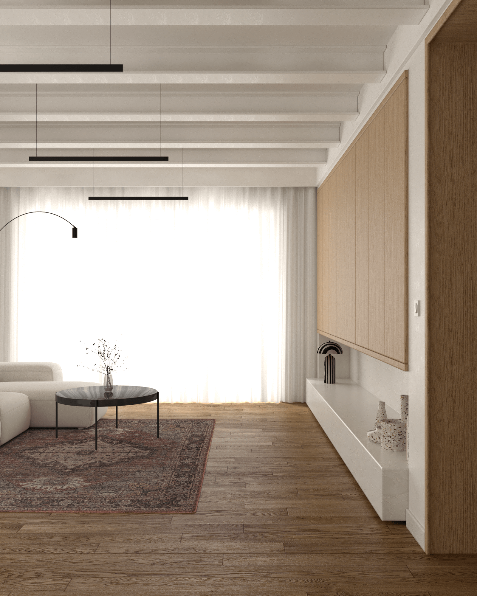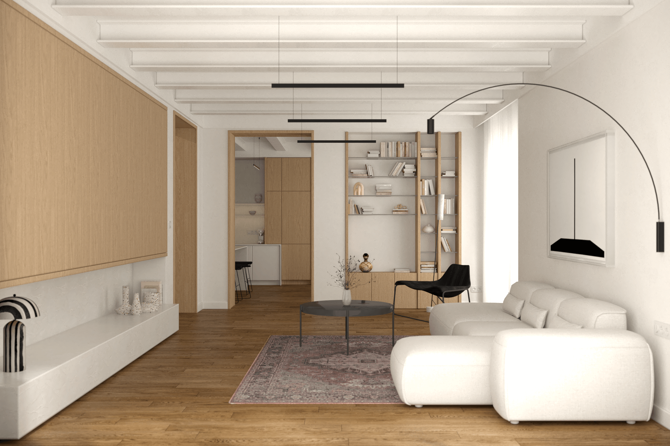 Biała sofa Partisan Lapsi, będąca centrum wypoczynku, kontrastuje z czarnym, okrągłym stolikiem kawowym oraz perskim dywanem, który wprowadza retro atmosferę. Czarne minimalistyczne lampy i wysoka zabudowa RTV z półką z białego marmuru dyskretnie ukrywają elektronikę, dbając o wizualny porządek. Skromna biblioteczka pozwala na wyeksponowanie ulubionych książek, a lampa stojąca COVO Noja nadaje wnętrzu ciepłego, intymnego charakteru.
