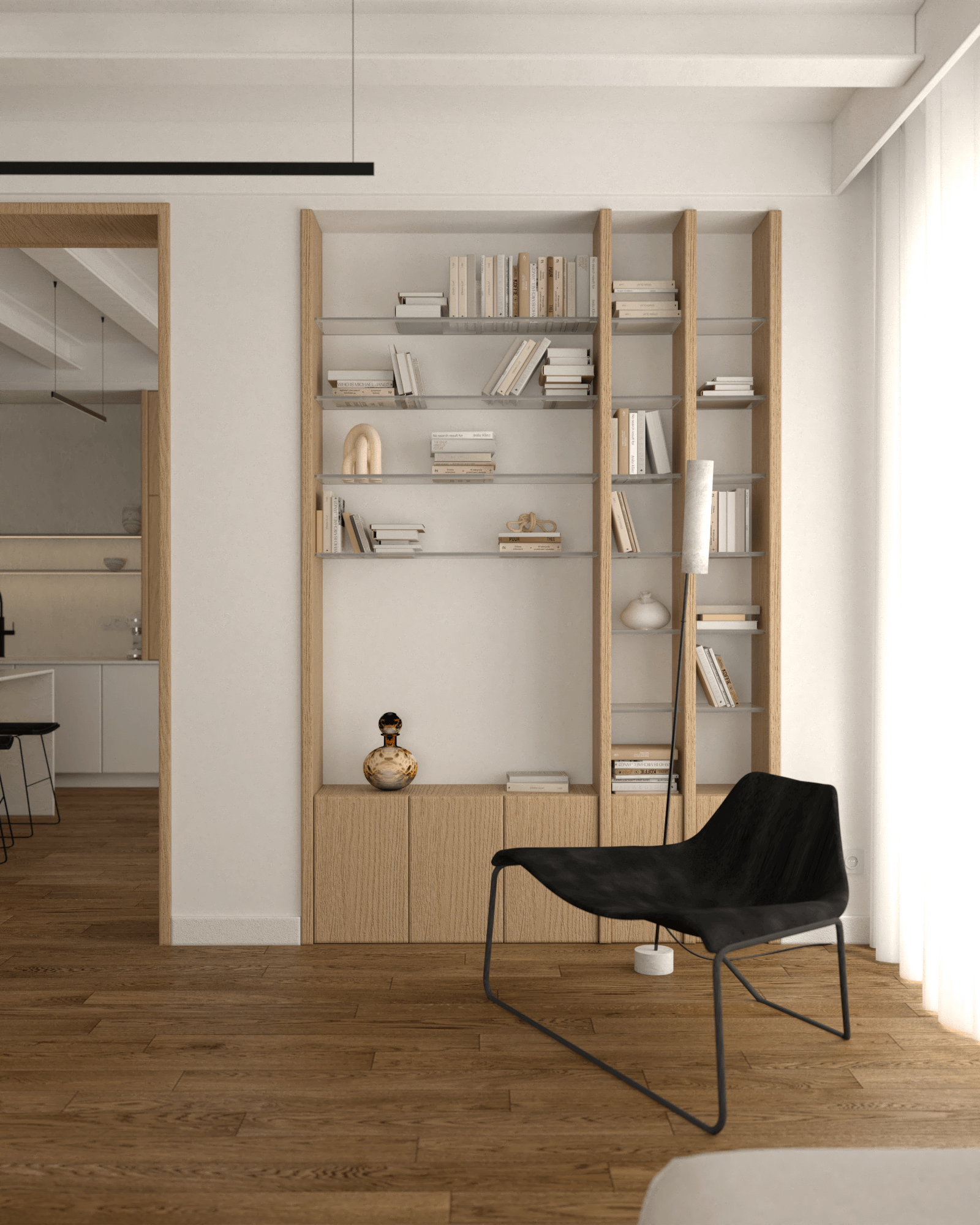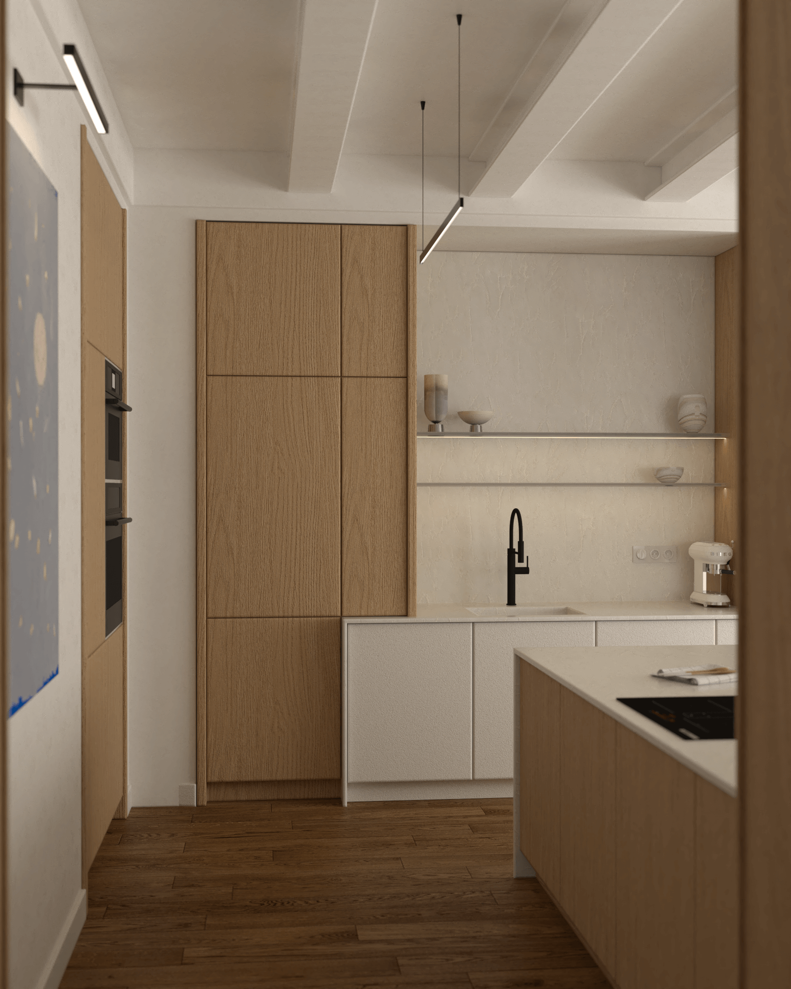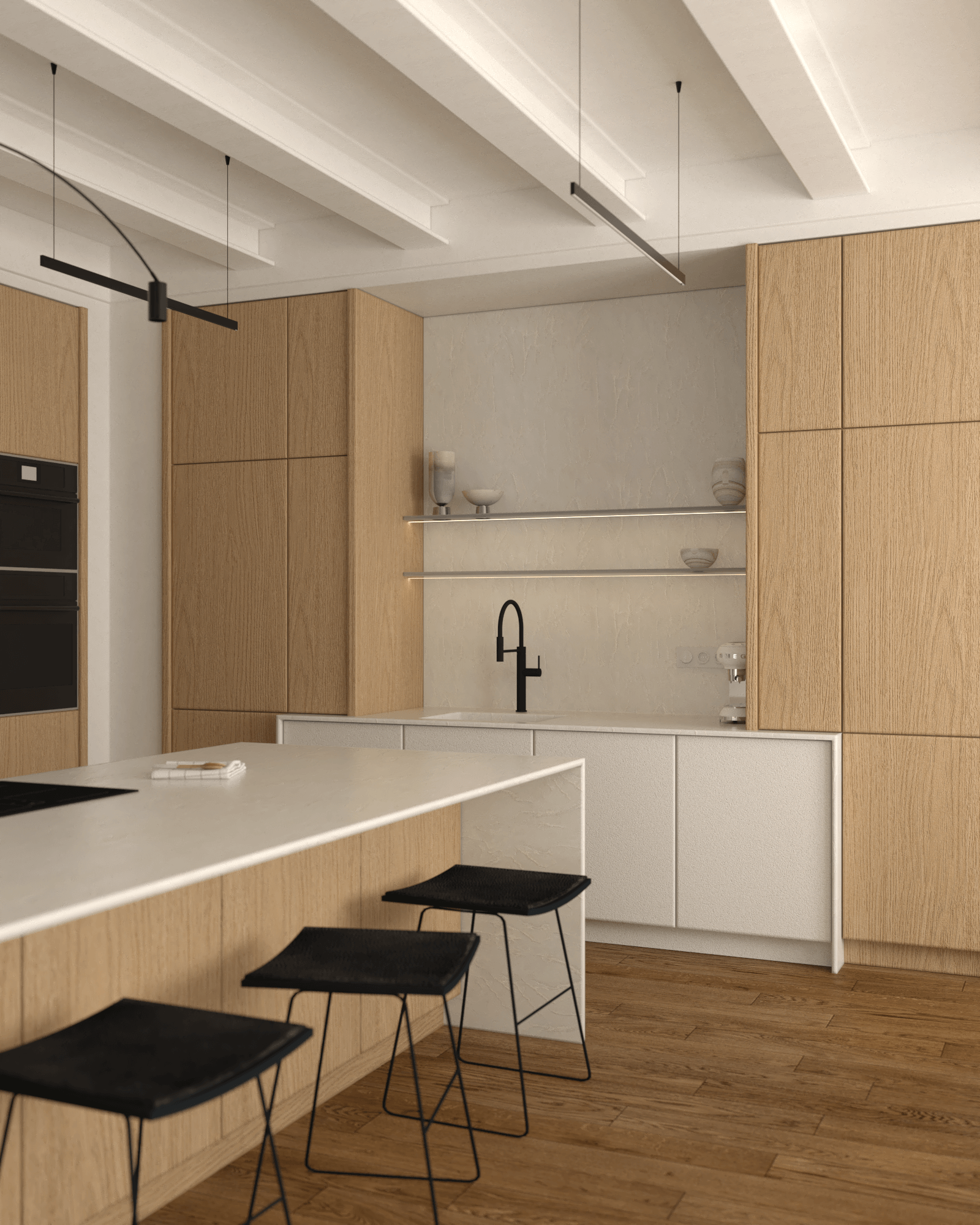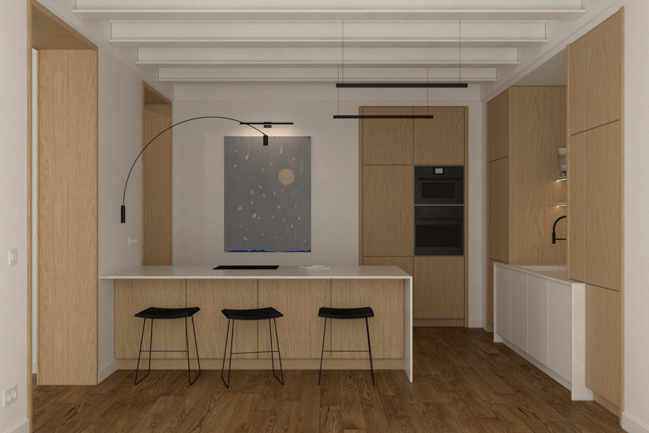Kuchnia została zaprojektowana z myślą o maksymalnej organizacji. Prostopadły układ blatów oraz wyspa kuchenna z białym marmurowym blatem oferują zarówno przestrzeń roboczą, jak i miejsce do spożywania posiłków na czarnych siedziskach. Wysoka zabudowa integruje sprzęty AGD, takie jak lodówka, piekarnik i mikrofalówka, zapewniając spójność wizualną. Umywalka zintegrowana to ukłon w stronę minimalizmu i wygody.