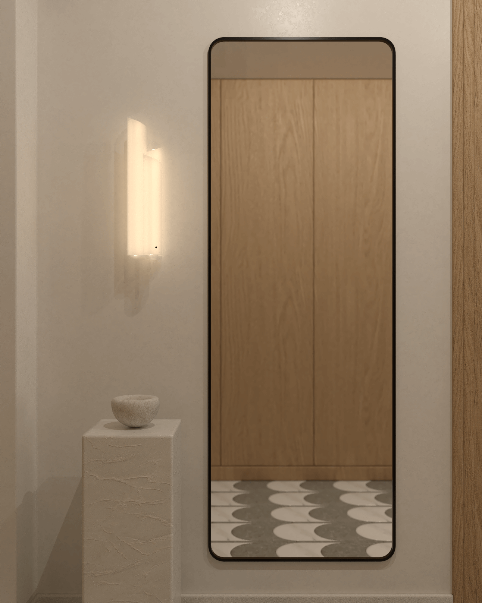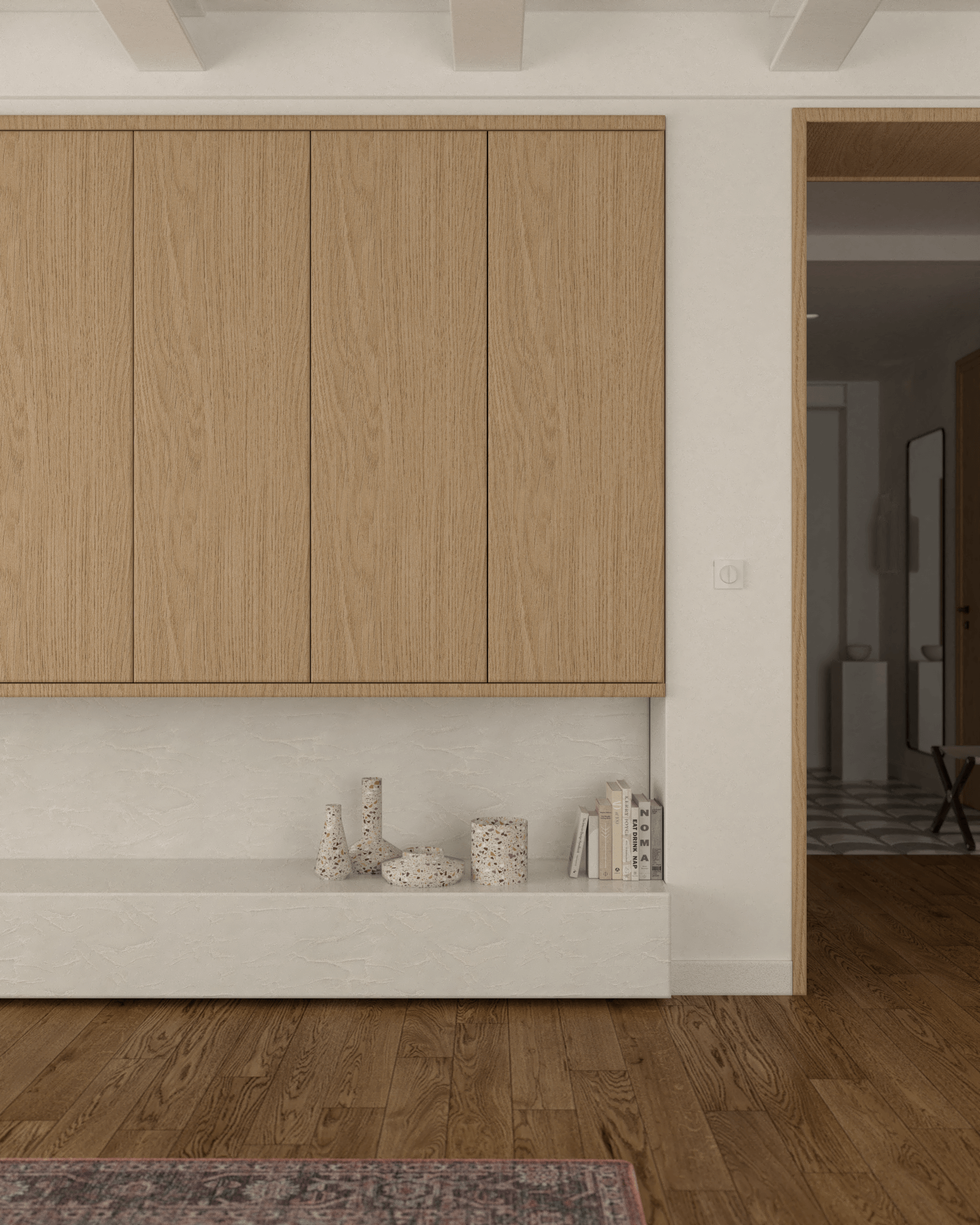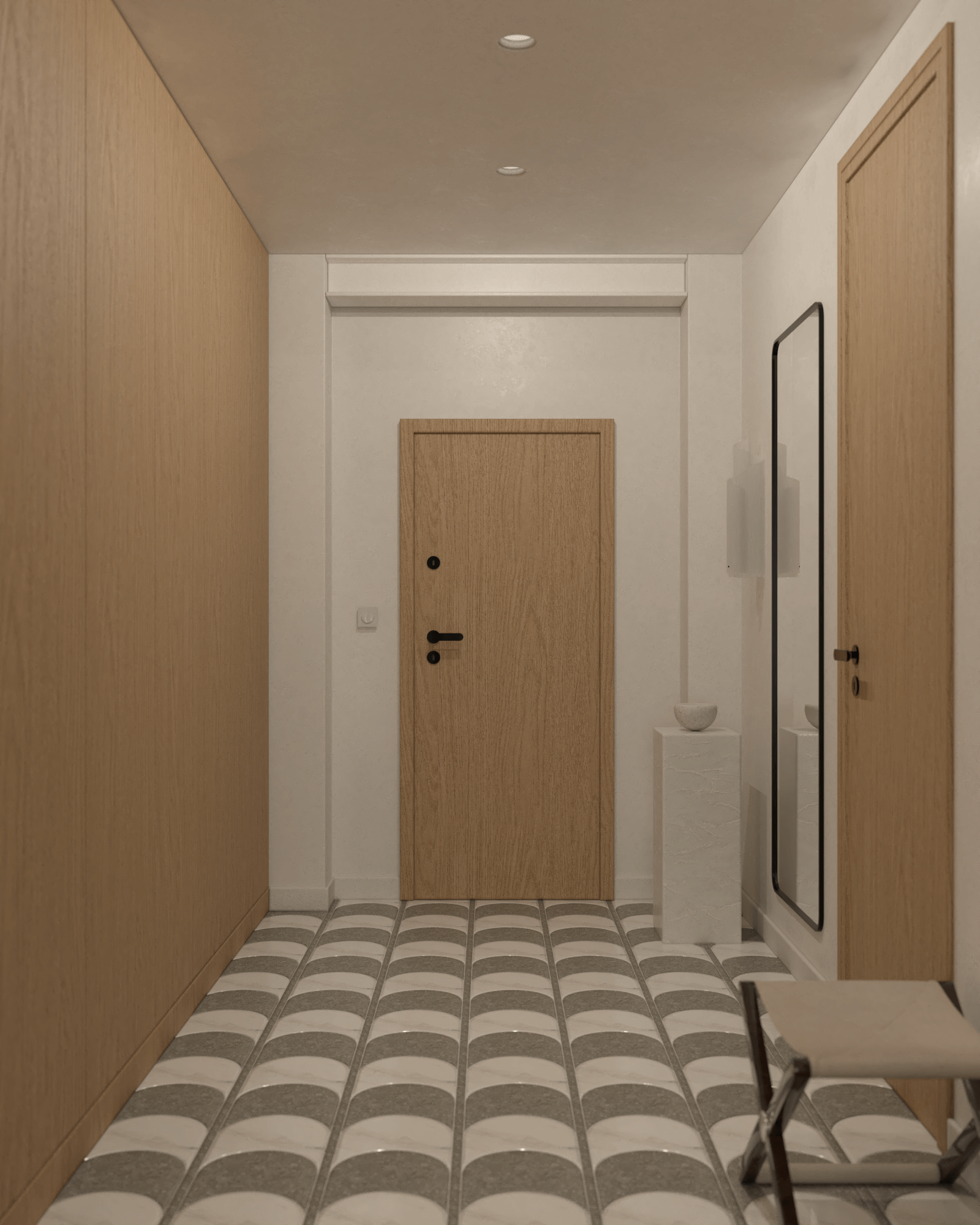 Na podłodze przedpokoju położono mozaikę Terratinta Vicentina, która podkreśla retro klimat mieszkania. Wysoka szafa umożliwia przechowywanie okryć wierzchnich i butów, zapewniając porządek już od progu. Minimalistyczne lustro w czarnej ramie powiększa optycznie przestrzeń, a siedzisko Paolo Castelli Chair Scranno dodaje elegancji i wygody.