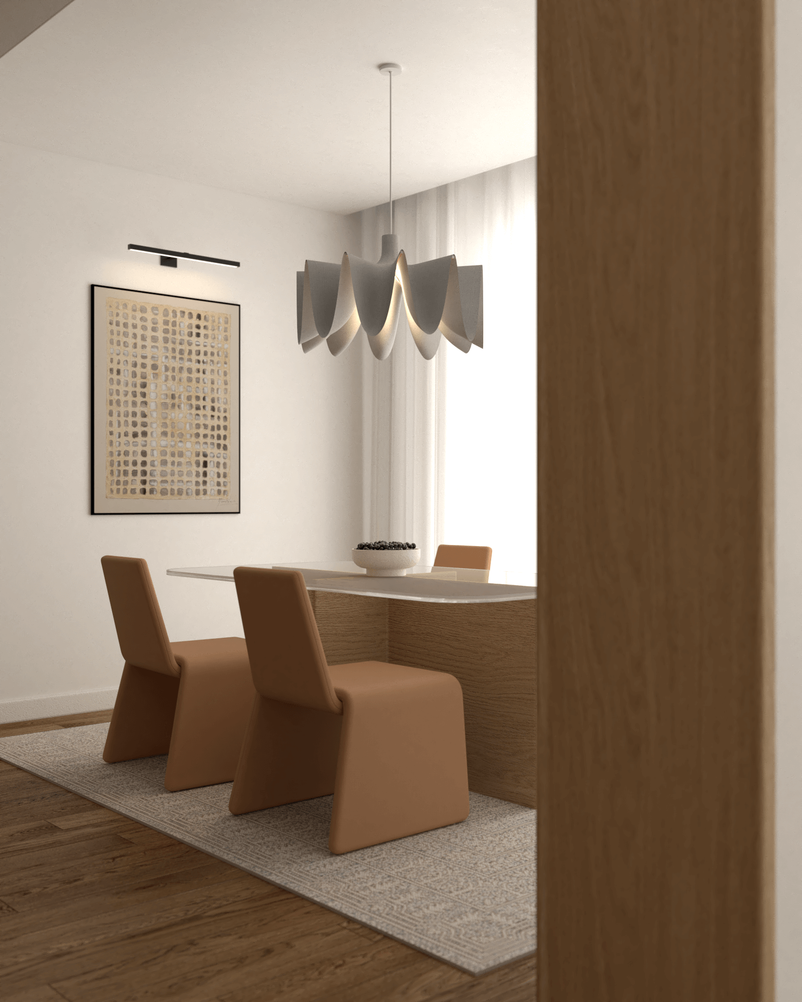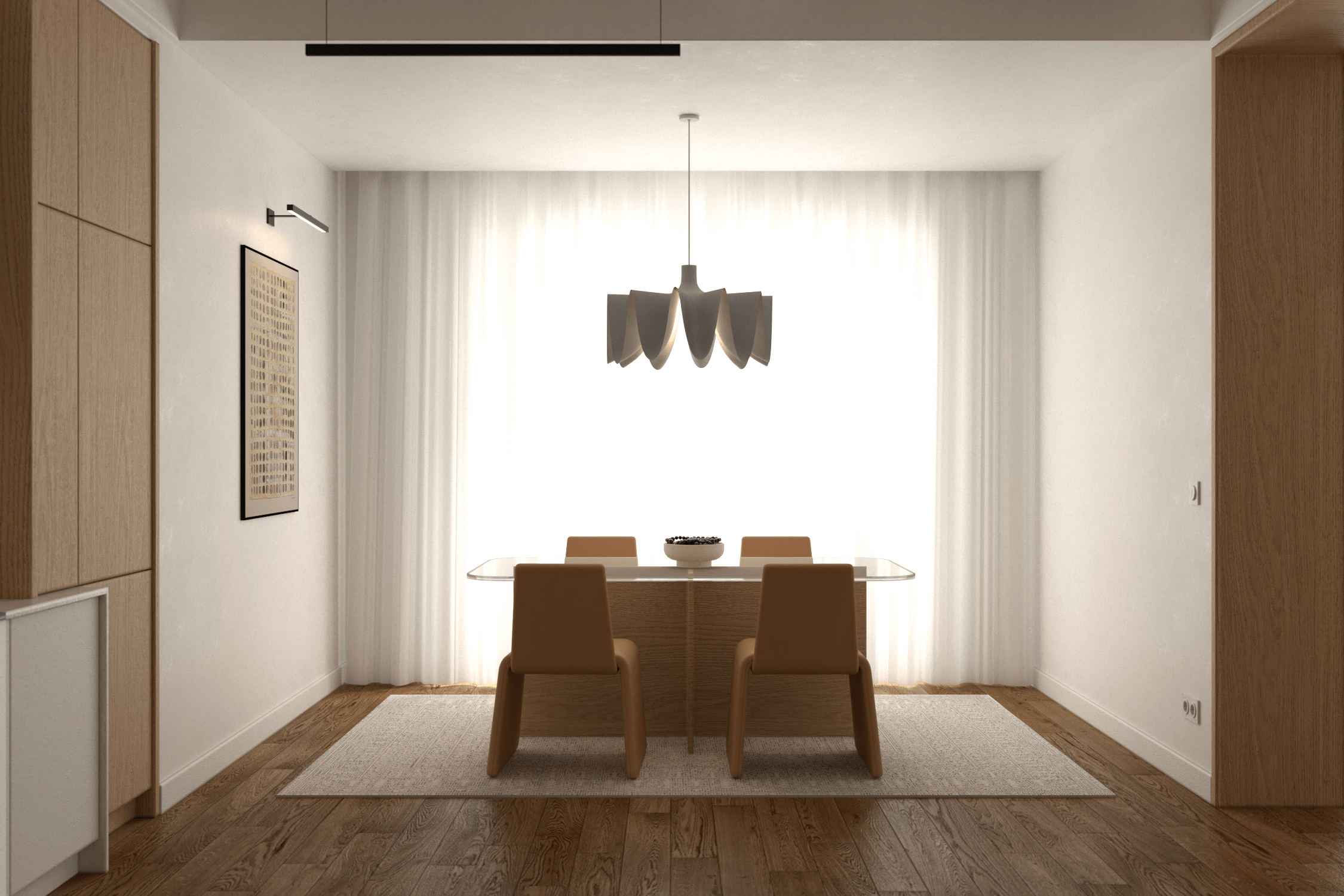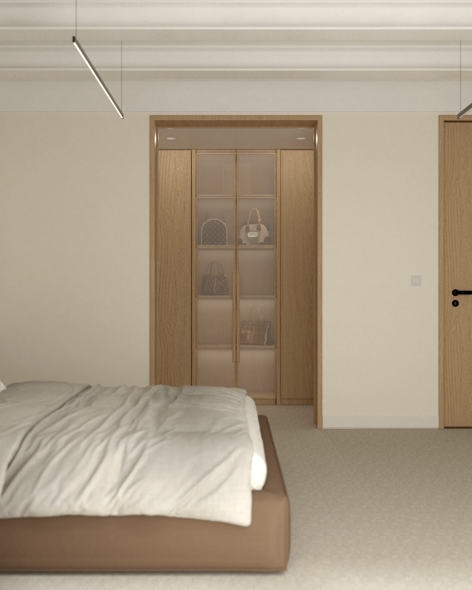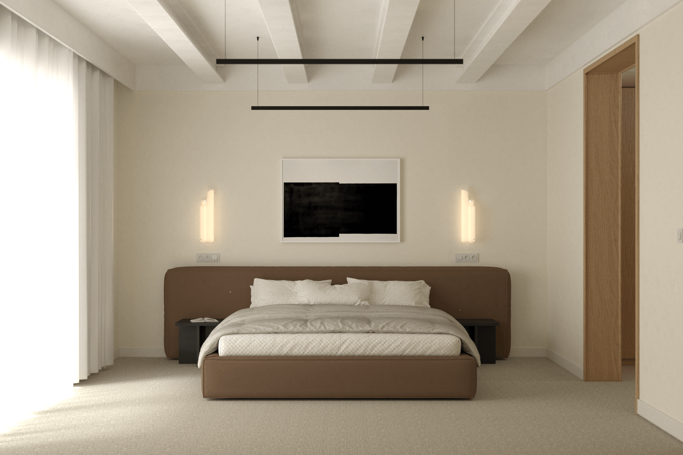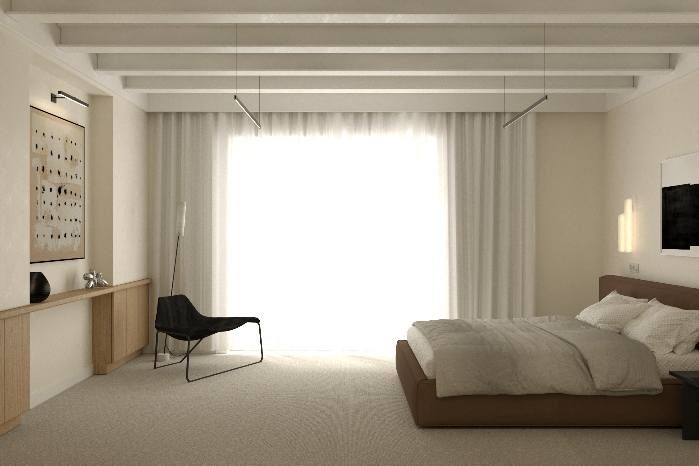 Sypialnia zaprojektowana z myślą o odpoczynku i relaksie zachwyca brązowym tapicerowanym łóżkiem kontynentalnym z dużym zagłówkiem, które stanowi centralny element wnętrza. Beżowa wykładzina ociepla przestrzeń, a czarne stoliki nocne i kinkiety Artemide Chimera wprowadzają wyrafinowany kontrast. Fotel Tacchini Glide oraz lampa stojąca tworzą dodatkowy kącik do relaksu, a jednocześnie wprowadzają spójność wnętrza z salonem. Garderoba zapewnia miejsce na ubrania, utrzymując przestrzeń w czystości i porządku.