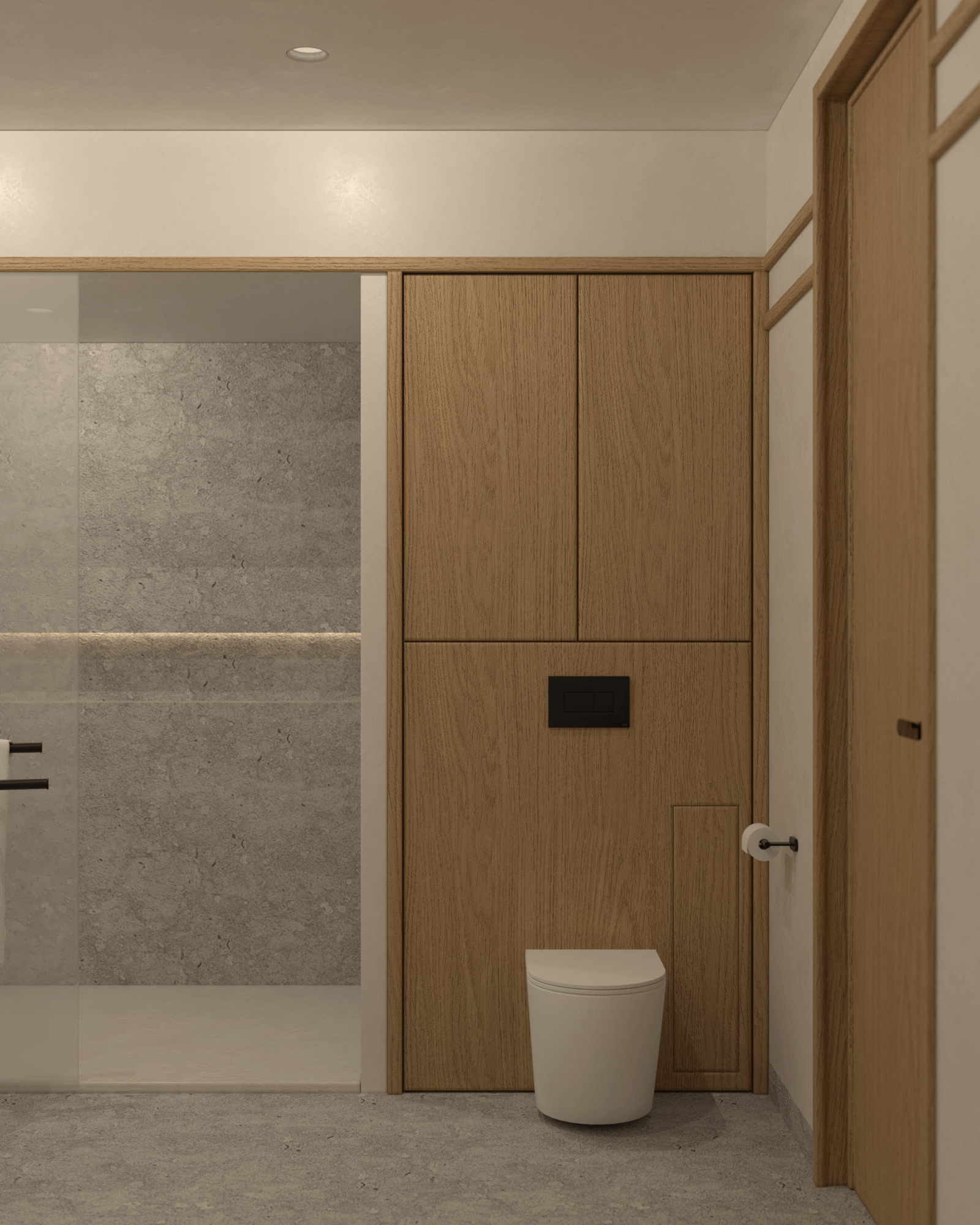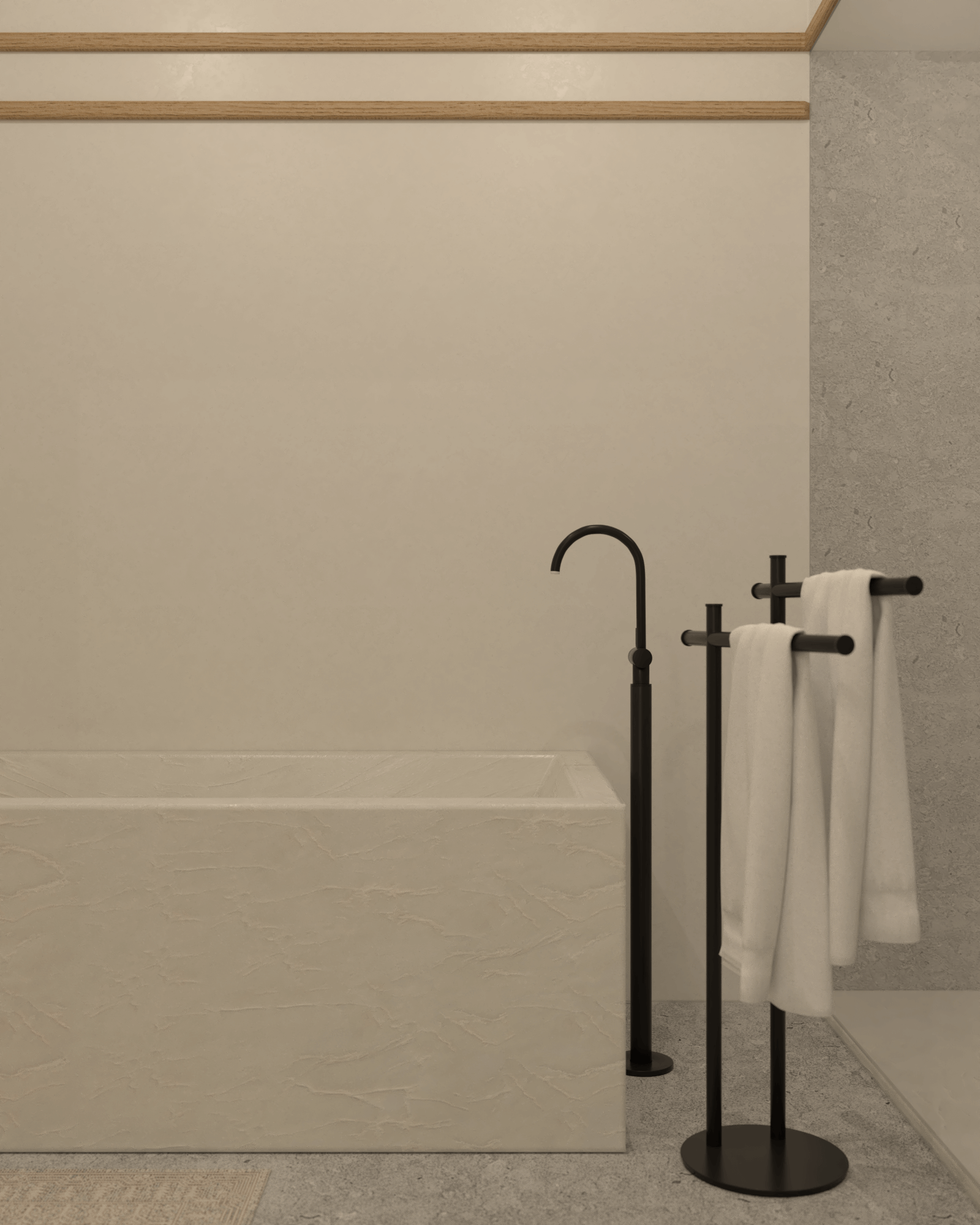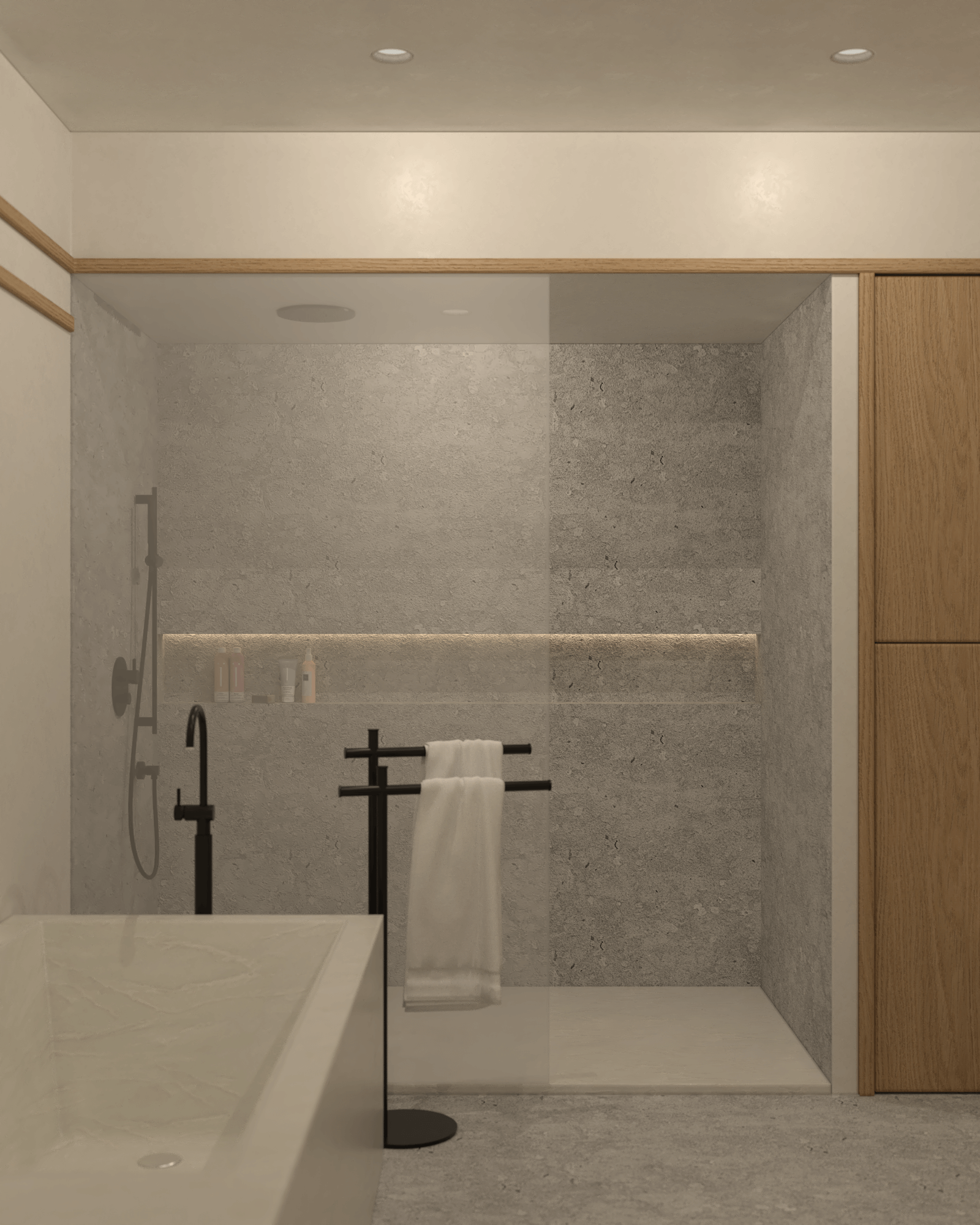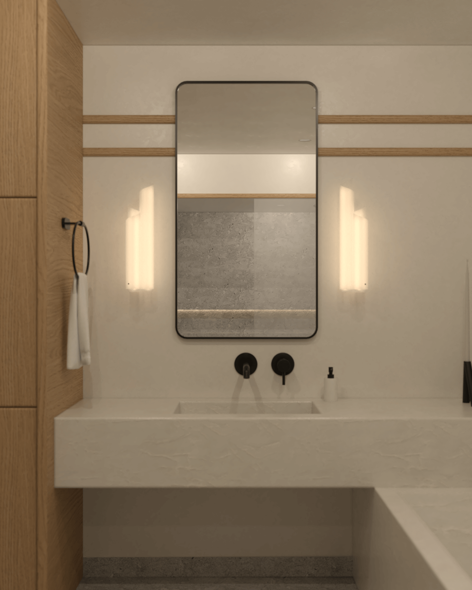 Łazienka to połączenie minimalistycznego designu z funkcjonalnością. Blat i wanna wykonane z konglomeratu harmonizują z prysznicem walk-in, a szara kamienna posadzka dodaje wnętrzu wyrafinowanego chłodu. Wysokie zabudowy drewniane pozwalają na ukrycie niezbędnych przedmiotów, utrzymując porządek. Subtelne oświetlenie zapewniają kinkiety Artemide Chimera oraz minimalistyczne lustro w czarnej ramie.